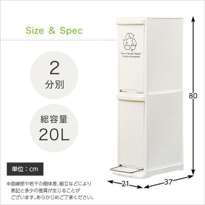 【商品について】縦型分別ダストボックス【Cocod-ココド-】(2段 スリム 省スペース フタ付き フットペダル ゴミ箱 20L)■サイズ:外寸:(約)21x37x80cm※商品重量:(約)3kg■カラー:ホワイト■素材:材質:ポリプロピレン■その他:・完成品でのお届けです。